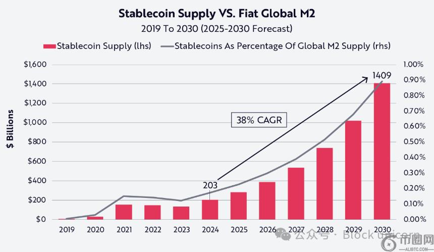 相比之下,全球稳定币市值约为 3000 亿美元,仅占美国 M2 货币供应量的约 1%。虽然**值仍然很小,但这种对比凸显了稳定币的快速增长及其巨大的扩张空间。稳定币实际上是运行在区块链上的数字美元,如果它们能够占据 M2 货币供应量的一小部分,其市场规模就可能达到数万亿美元,从而重塑支付、汇款和全球美元分配格局。