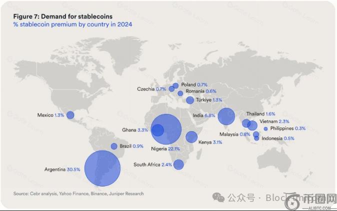 在市场承压的情况下,需求非常强劲,人们甚至愿意支付高于美元面值的溢价来获取**化的美元。在阿根廷,USDT 的交易价格曾比官方汇率高出 30%。这凸显了人们对数字货币的信任程度远高于对本地银行或政府担保的信任程度。