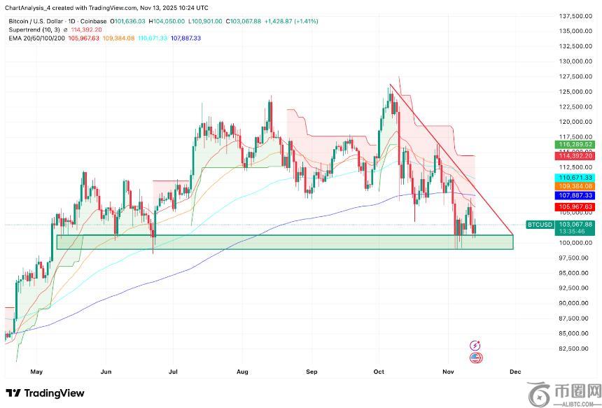 **个阻力位目前位于 20 日均线附近,约为 105,900 美元,其次是 109,300 美元和 110,600 美元,50 日均线和 100 日均线在此交汇。超级趋势阻力位更高,位于 114,400 美元,这是趋势反转的关键门槛。如果日线收盘价高于这些移动平均线,则将确认买方力量的回归。如果价格未能守住 101,000 美元上方,则可能再次下探至 98,000 美元附近的下行区间,从而暴** 95,000 美元附近的更深支撑位。