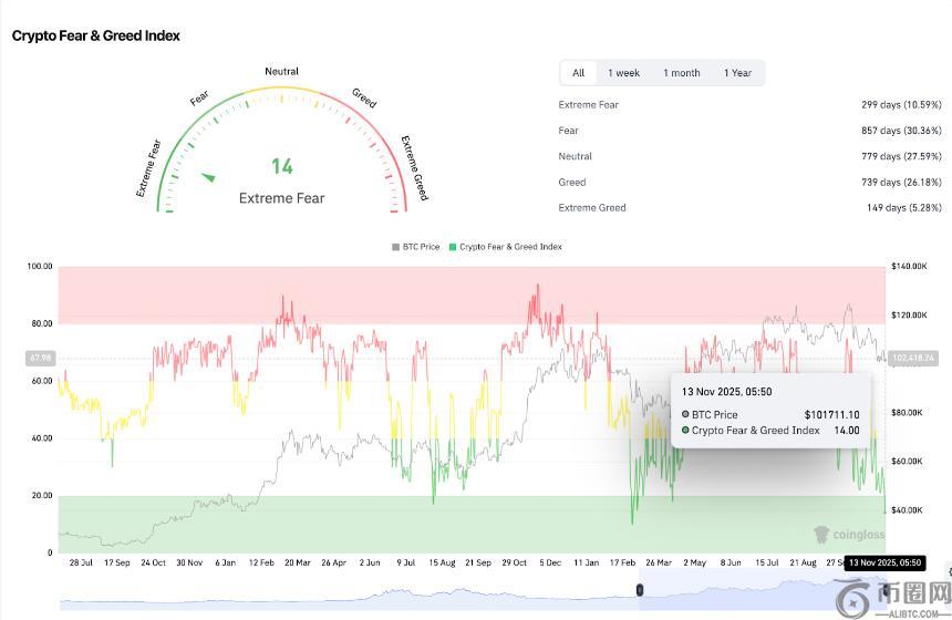 加密货币恐慌与贪婪指数已跌至14,创下3月以来的**水平,表明整个市场处于“极度恐慌”状态。这种水平通常与局部底部相吻合,但也凸显了市场缺乏推动强劲反弹的信心。交易员似乎不愿投入新的资金,直到价格确认有效突破自9月以来一直限制价格走势的下跌结构。