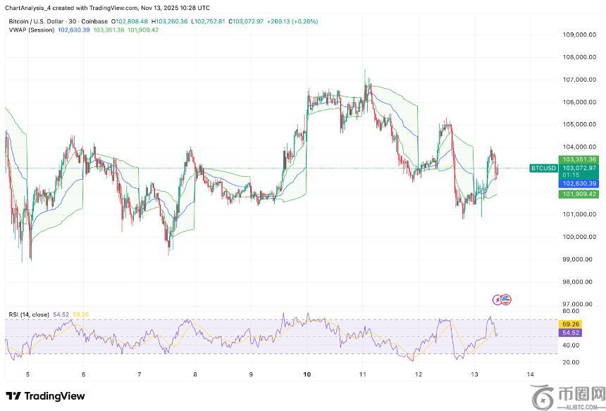 在30分钟图表上,比特币交易价格略高于102,600美元的成交量加权平均价(VWAP),并在101,900美元至103,400美元的狭窄日内通道内波动。这种窄幅波动反映了波动性下降以及在下一轮方向性走势之前较为均衡的仓位配置。