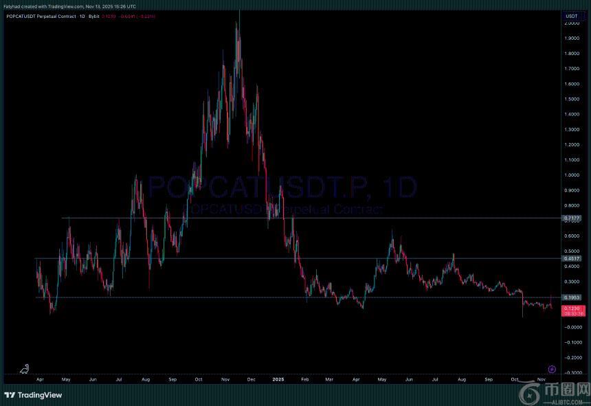 POPCAT于2022年推出,在充满活力的社区和Solana链上生态系统的推动下,于2024年11月飙升至2.05美元的历史新高。然而,到了2025年11月13日,POPCAT的价格已较其峰值下跌近91%,徘徊在0.123美元左右,市值接近1.21亿美元。