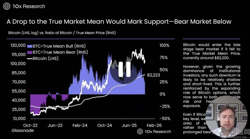 - 从历史趋势来看,当比特币价格跌破真实均价时,市场通常会进入深度熊市阶段。目前真实均价约为 82,000 美元,这一价格是比特币牛市结束、熊市开始的重要分界线。如果价格跌破这一水平,市场可能会先测试 93,000 美元的关键支撑位。