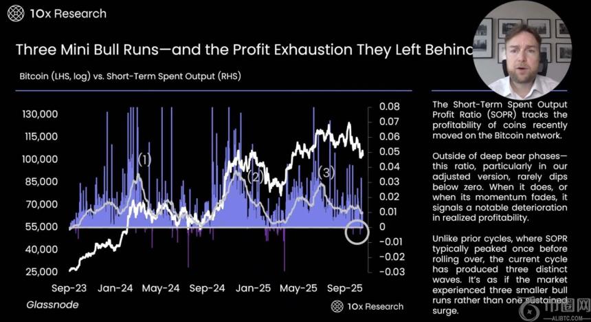 - 短期支出输出指标 (Short Term Spend Output) 是一个重要的工具,用于追踪近期在比特币网络**通的币是否处于盈利状态。过去两年,比特币曾经历过两到三次短暂的牛市,但这些牛市的持续时间都较短,且市场动力迅速减弱。随着市场进入低迷状态,我们可以观察到一波接一波的价格反弹,但反弹幅度逐渐缩小,显示出市场的复苏力度正在下降。