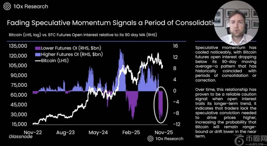 - 这表明,当市场中的期货交易者减少时,比特币价格很难实现反弹。我们可能正在经历类似的情况,因为在之前的市场修正中,我们也观察到,一旦期货交易者撤离并解除多头头寸,市场反弹就变得异常困难。这也是我们保持谨慎态度的原因之一。我们密切关注未平仓合约 (open interest)、期货头寸和资金费率的变化,这些数据目前都未显示出看涨信号,反而表明交易者采取了非常谨慎的风险管理策略。