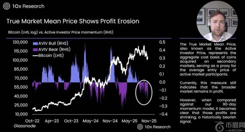 - 链上指标为我们提供了更为谨慎的市场视角。例如,比特币与真实均价 (True Mean Price) 的比率是通过投资者市值 (Investor Cap) 除以活跃供应量计算得出的,用以衡量市场参与者持有币的平均成本。当前数据显示,短期持有者的市场动能正在逐渐减弱,大多数短期投资者正面临亏损。