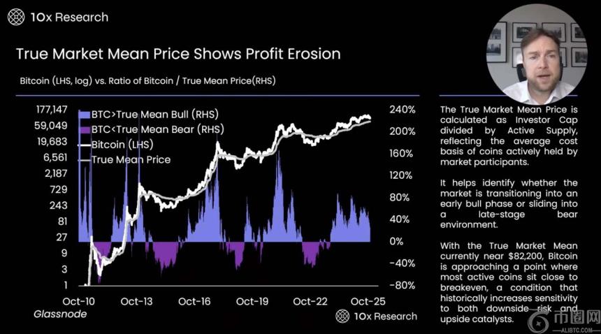 - 活跃投资者价格均值 (True Market Mean Price) 是一个重要的市场指标,用于反映比特币在二级市场中的整体买入成本。它可以看作是活跃投资者的平均买入价格,用于分析市场参与者的成本压力和行为倾向。当投资者面临亏损时,通常会选择出售或清算资产,这种现象在市场的不同阶段都曾**出现。