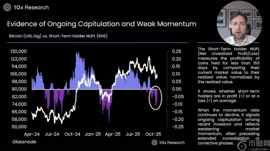 - 短期持有者未实现净利润 (Short Term Holder Net Unrealized Profit) 是一个重要指标,用于衡量持币时间少于 155 天的投资者是否处于盈利状态。该指标通过比较币的当前市场价值与其已实现价值,并进行归一化处理,来反映短期持有者的投资表现。目前数据显示,市场动能正在减弱,同时出现了更多投资者“投降式”抛售的迹象,这与当前市场的低迷状态相符。