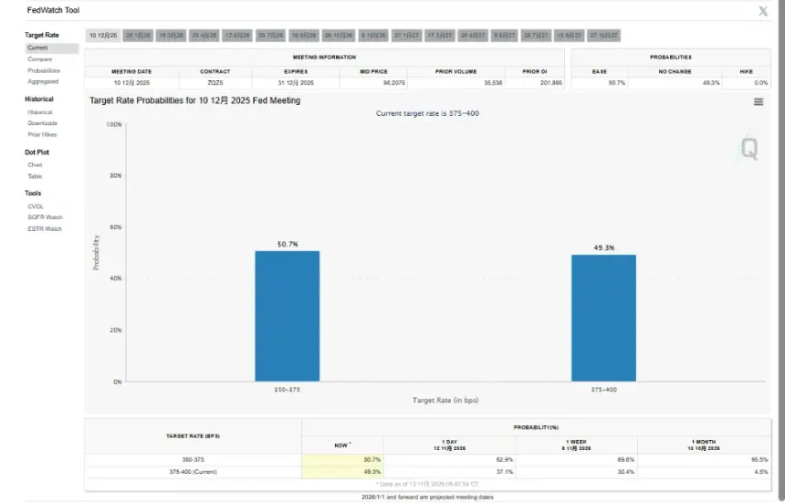 此次抛售的直接导火索是多位美联储**发表的谨慎言论,暗示降息需更加审慎。根据芝商所(CME)的数据,利率期货市场显示,降息概率已从一周前的超过70%骤降至50%左右。