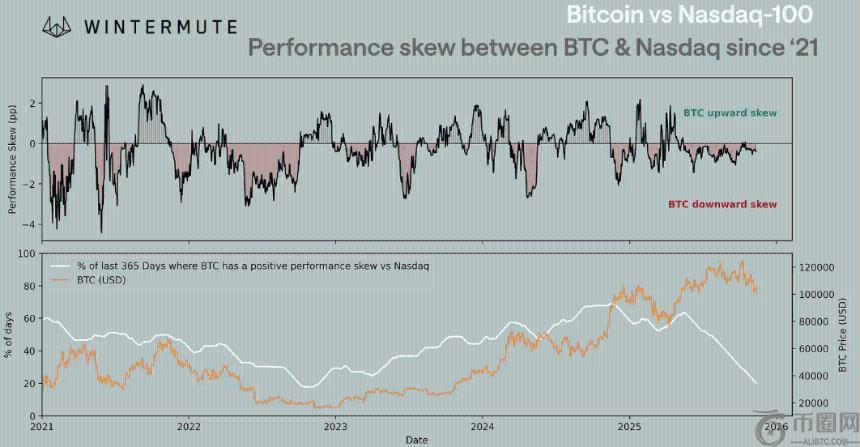 尽管两种资产之间的不对称性正在逐渐收紧,但相对于纳斯达克100指数而言,正偏度天数已降至自2022年熊市以来365天**平均值的**水平。