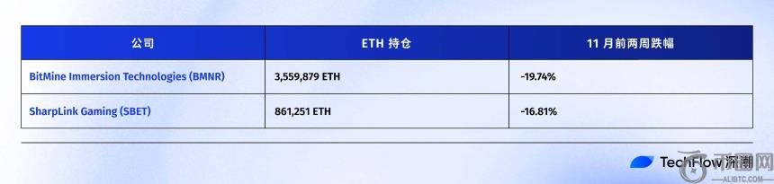 这些公司把ETH作为财库主要资产。11月前两周,ETH价格从$3,639跌至$3,120(-14.3%),但它们的股价跌幅达到17-20%。