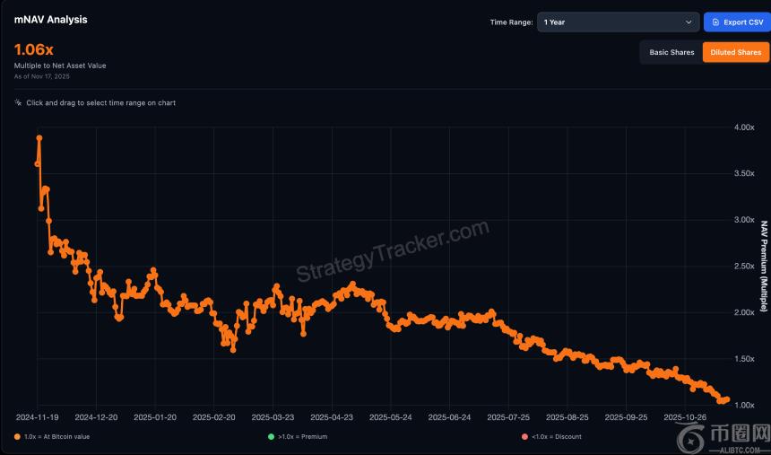 mNAV,市场净值倍数,是衡量 MSTR 股价相对其 BTC 资产溢价的关键指标。