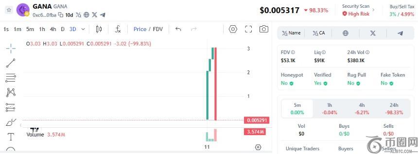 Gana 项目的图表显示,价格直线下跌,一根巨大的红色蜡烛线预示着抛售潮和恐慌情绪蔓延。这场突如其来的暴跌在几分钟内几乎抹去了该**的**价值。