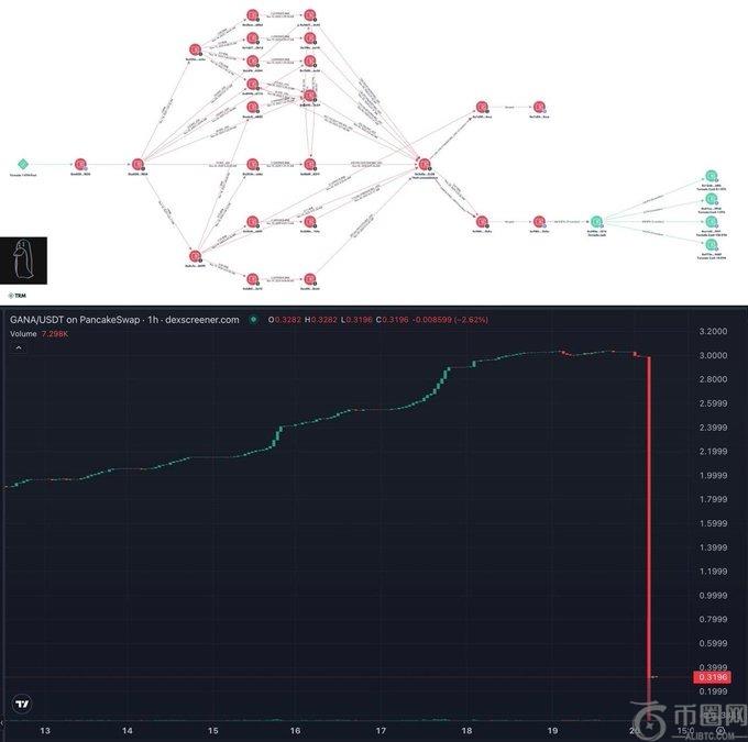 这使得他们能够控制 GANA 支付智能合约,并操纵 PancakeSwap 资金池中的奖励机制。通过人为抬高奖励并抽空流动性,攻击者在极短时间内成功窃取了大量**。