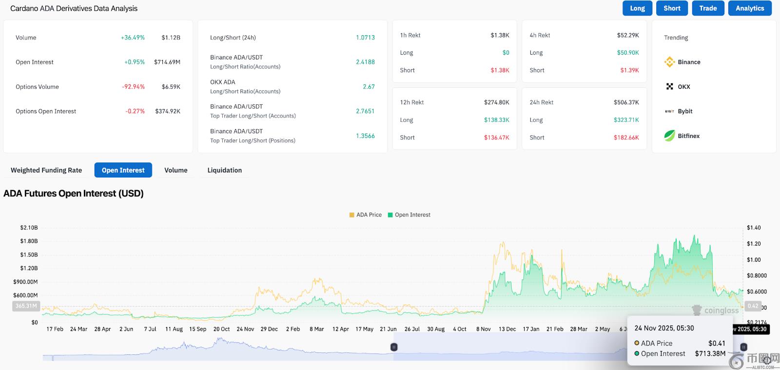 ADA衍生品交易活动显示参与度不断提高,但仓位依然保守。成交量攀升36.49%至11.2亿美元,表明随着ADA价格从局部低点反弹,交易者兴趣重燃。