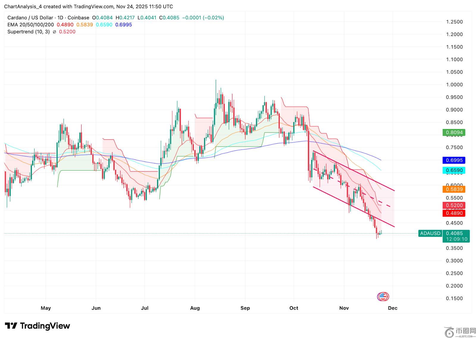 卡尔达诺 (Cardano) 价格今日在 0.4085 美元附近交易,在上周飙升至 0.38-0.39 美元区域后企稳。短期反弹表明市场已尝试复苏,但整体结构依然看跌,因为 ADA 继续在陡峭的下降通道内交易,每次反弹都在下降指数移动平均线 (EMA) 下方受阻。
