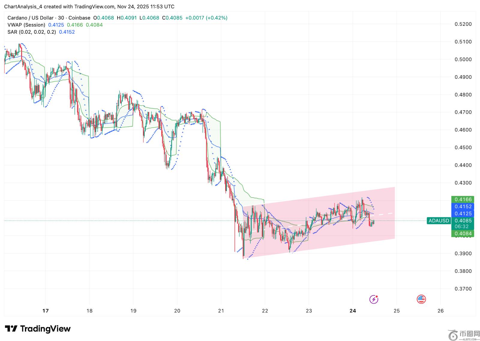 在30分钟图表上,ADA正在形成一个狭窄的上升通道,试图在本周早些时候的暴跌后构筑一个反弹结构。价格在0.4125美元至0.4166美元之间波动,该区域的成交量加权平均价(VWAP)与短期阻力位重合。