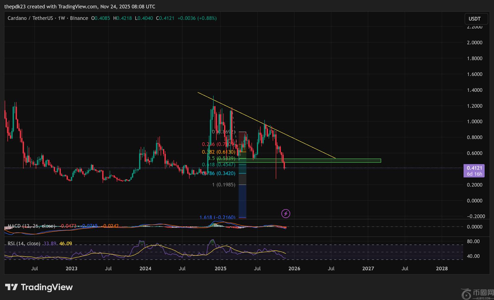 根据报道,Cardano 的 ADA 交易价格接近 0.41 美元。CoinMarketCap截至发稿时,ADA的周线图显示其长期下跌趋势仍在延续,一条持续下降的阻力线已持续一年多。