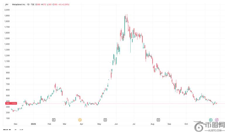Metaplanet股价上涨2.24%,至365日元。不过,目前股价仍比6月份的历史高点低80%以上。