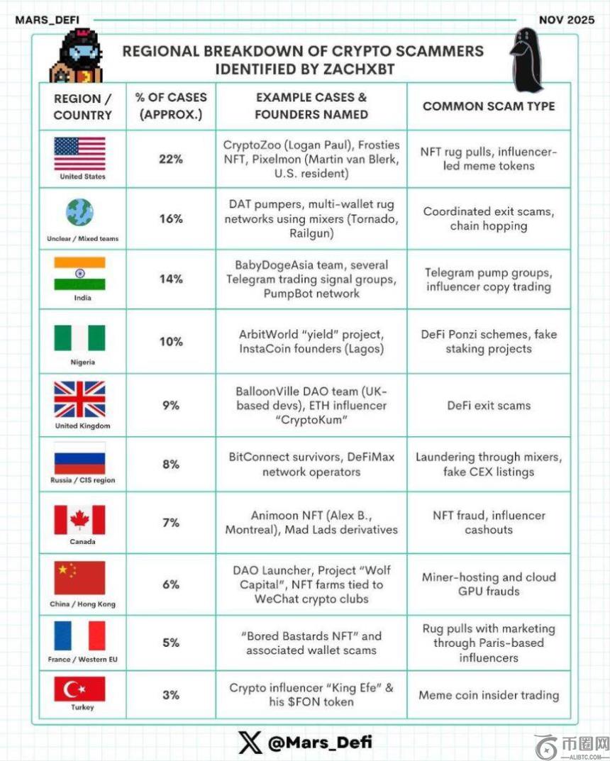仅在2022年至2025年间,ZachXBT记录了118起不同类型的金融欺诈案件,从数百万美元规模的NFT跑路案到复杂的跨链**网络。他的调查报告揭露了各大洲的**分子:既有硅谷网红背书的Memecoin项目方,也有孟买的Telegram**团伙,以及伊斯坦布尔的拉盘砸盘团伙。