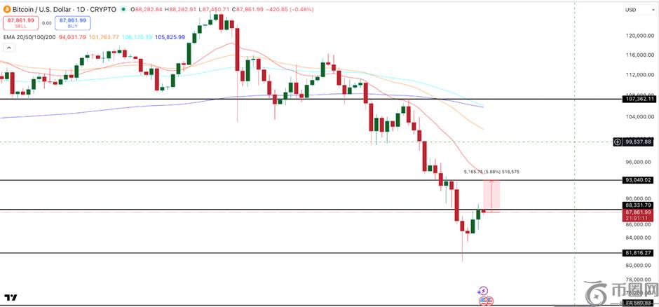 但图表上还有一个重要的考验。旗舰加密货币的价格必须突破 88,300 美元。