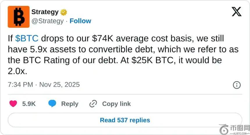 周三,Strategy 在其官方 X 账户上表示,即使比特币跌至 74,000 美元的平均成本价,其持有的比特币仍可覆盖其可转换债务 5.9 倍——该公司将这一比率称为其“比特币评级”。