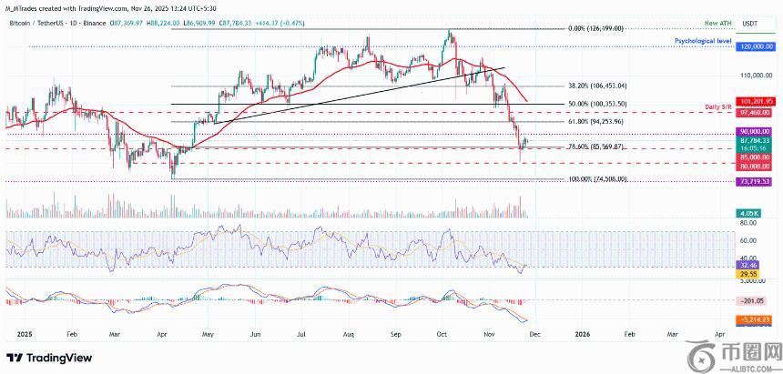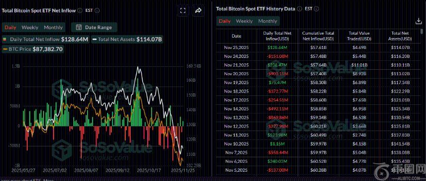 截至周三发稿时,比特币 (BTC) 价格徘徊在 87,700 美元附近,此前已从 10 月初创下的 126,199 美元的历史高点回落超过 36%。现货比特币交易所交易基金 (ETF) 的资金流动情况复杂,进一步支撑了这种区间震荡的价格走势。此外,一份报告指出,BTC 的价格可能进入盘整阶段。本星期由于感恩节假期,美国市场下半场休市。