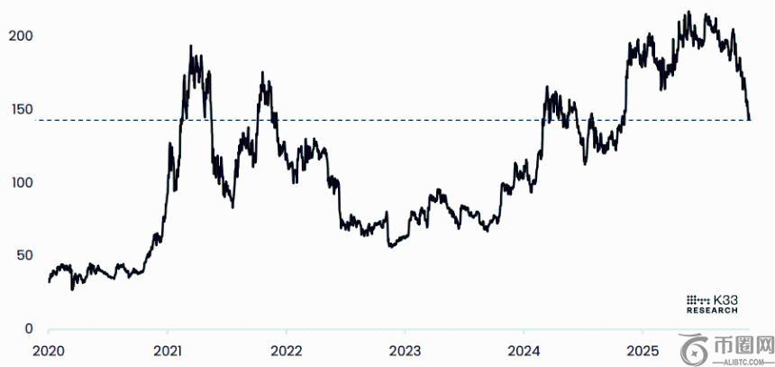此外,如下图所示,BTC 相对于 QQQ 指数的价格已跌至 143,为 2024 年 11 月 5 日以来的**水平。换句话说,美国总统大选后的所有相对强势均已回落。如今的比特币参与者与 2021 年的参与者,甚至与 2024 年**季度比特币价格上涨期间的参与者都截然不同。
