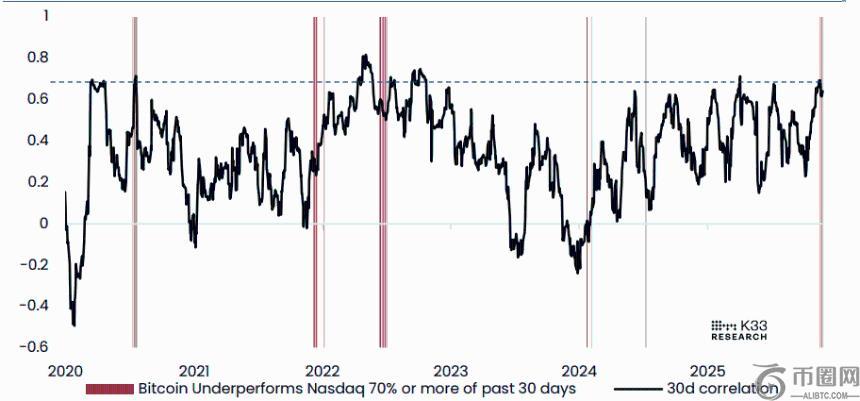 比特币与纳斯达克指数的30天相关性,以及持续表现不佳的时期。