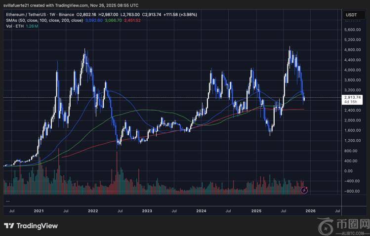 以太坊周线图显示,在 4400 美元区域遭遇强劲阻力并跌破 3200 美元支撑区后,其趋势结构明显恶化。抛售潮将 ETH 推至 2700 美元中段附近,随后出现小幅反弹,但价格仍低于关键移动平均线,表明卖方力量依然强劲。