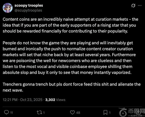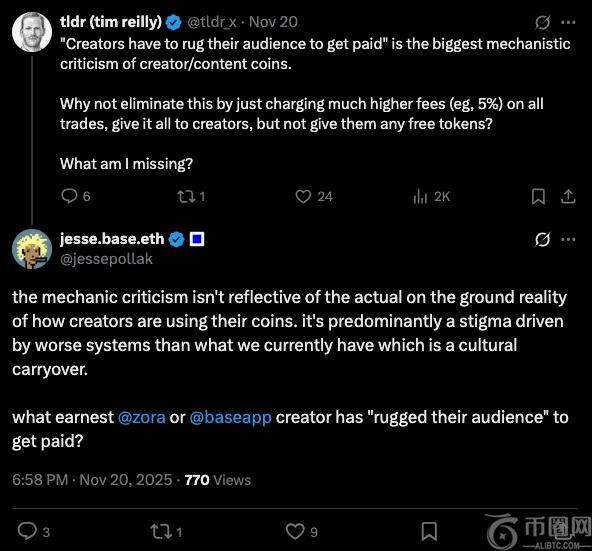 - 这种模式倾向于将创作者的收入前置,在初期价格发现阶段可能会带来大额交易费用,但长期交易量是否可持续却是不确定的($JESSE 的表现将成为一个观察点)。这种机制并未真正实现创作者与**持有者之间的激励一致性。