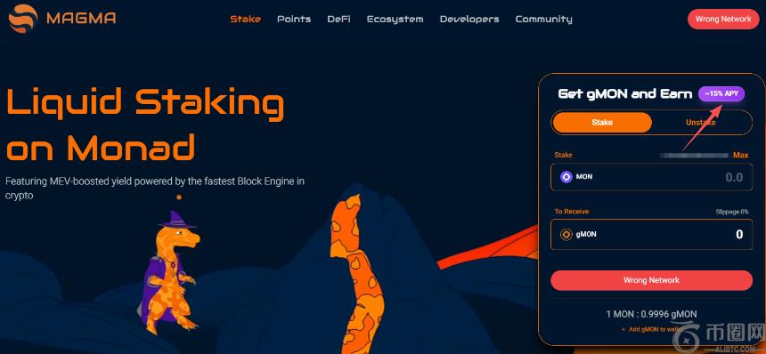 Magma 是基于 Monad 区块链的流动性质押协议,截至目前其融资总金额为 390 万美元。Magma 现已上线质押 MON 铸造 gMON 积分活动,当前年化收益率为 15%。