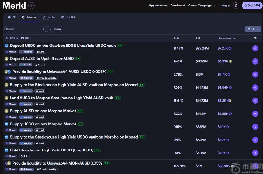 除了上述质押 MON 赚币外,Merkl 上也有不少存稳定币挖 MON **的机会(链接:https://app.merkl.xyz/chains/monad?sort=tvl-desc),可以根据自身情况选择。目前 TVL **的赚 MON **为 Gearbox 项目,TVL 为 2300 万美元,存 USDC 赚 MON **的年化利率为 11.43%。