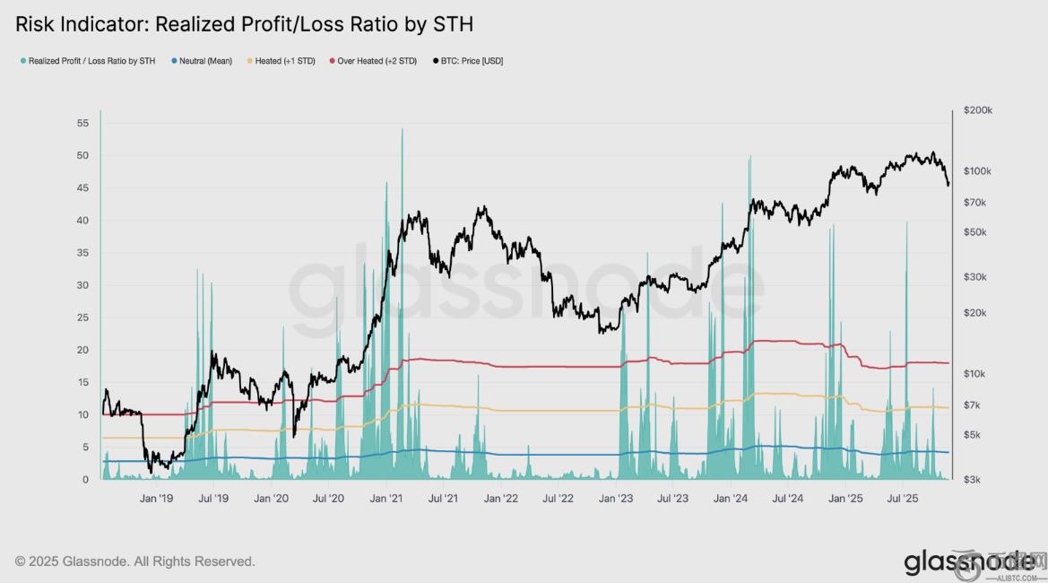 报告进一步解释说,随着市场结构**,流动性成为理解未来走势的关键指标。长期低流动性会增加市场进一步萎缩的风险,而STH已实现盈亏比率则提供了反映当前需求动能的最清晰窗口之一。该比率衡量的是近期投资者的已实现利润与已实现亏损之比,10月初已跌破其中性均值(4.3倍),目前已跌至0.07。