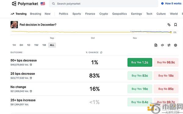 CME“美联储观察”数据显示,美联储12月降息25个基点的概率为84.9%,维持利率不变的概率为15.1%。美联储到明年1月累计降息25个基点的概率为66.4%,维持利率不变的概率为11.1%,累计降息50个基点的概率为22.6%。此外,Polymarket数据显示,“预测美联储12月降息25个基点概率升至83%”,维持利率不变的概率跌至16%,该预测事件交易量已达1.73亿美元。