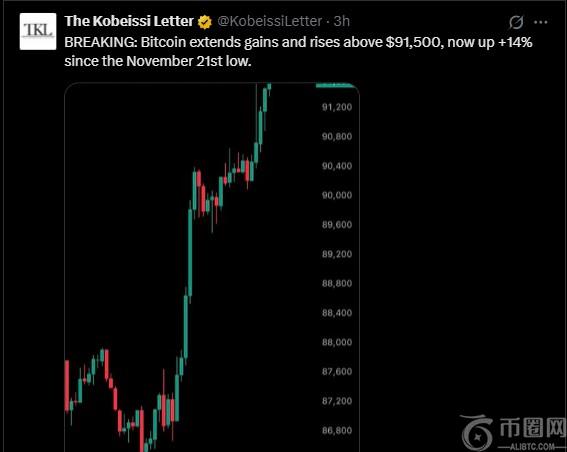 比特币今天在加密货币行业强势反弹。几天前跌至 8 万美元后,**的“比特币价格分析”显示,目前比特币价格已突破 91,500 美元,较 11 月 21 日的低点强劲反弹 14%。