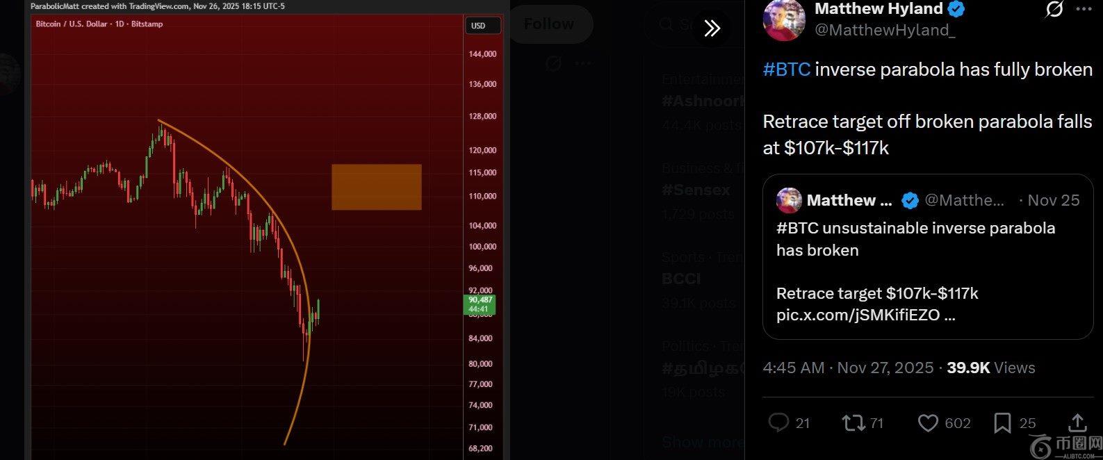 **消息是,分析师马修·海兰德数据显示,该**已突破其向下倒抛物线,这可能预示着其价格将上涨至 107,000 美元至 117,000 美元。