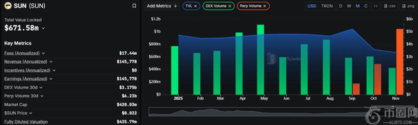 据 DeFiLlama 数据显示,11 月 20 日 SUN.io 平台总锁仓量(TVL)为 6.7 亿美元,长期稳居全球 DEX 前五阵营。
