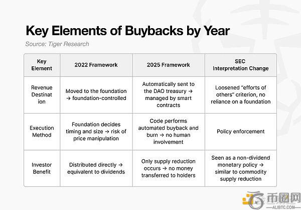 2025 年,回购与自动销毁机制结合重现。在这种模式下,收入不直接分配给**持有者,基金会对价格或供应没有控制权,销毁过程通过算法执行。因此,该结构进一步远离了监管机构先前标记的要素。