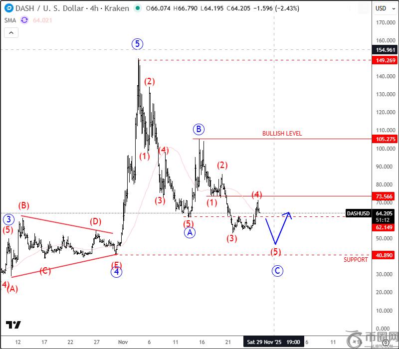 正如预期,Dash 近期经历了一波强劲的五浪上涨行情,但目前的下跌表明,五浪上涨行情似乎已经结束,我们现在正处于更高阶的三浪 ABC 回调阶段。在 4 小时图上,Dash 似乎已经进入 C 浪,并且可能正处于 C 浪的**一个子浪(第 5 浪),该子浪可能在 50-40 区域找到强支撑。如果 Dash 突然突破 73.50 区域,则支撑位可能存在,但只有突破 105 才能确认看涨信号。