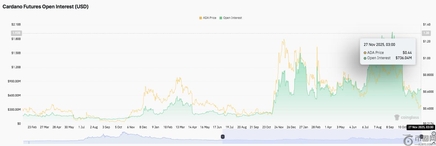 ADA期货未平仓合约量持续下滑,此前曾一度超过19亿美元。交易员全年持续减持,截至11月27日,未平仓合约量已降至7.36亿美元左右。这一降幅表明,由于价格走势**,市场对杠杆头寸的需求正在减弱。