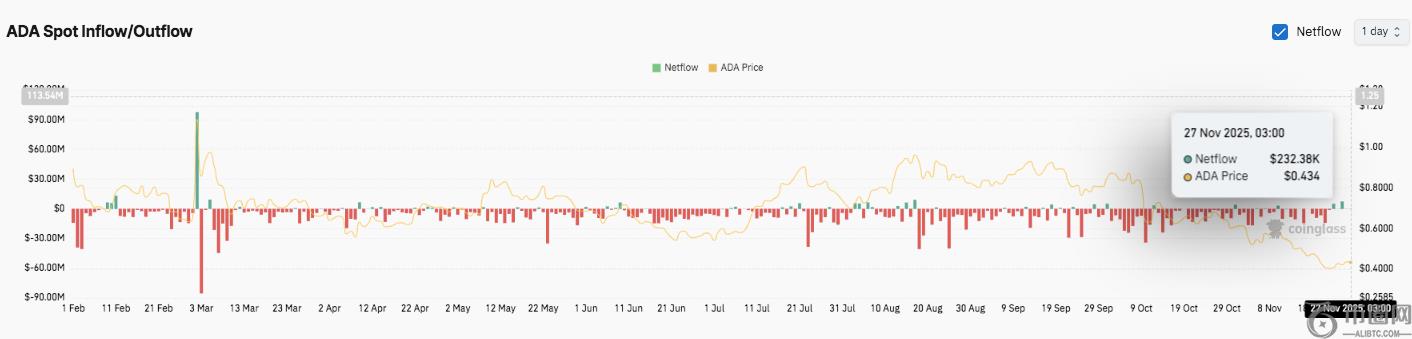 现货资金流入和流出数据显示,大部分交易日均出现持续的净流出。当ADA价格接近0.40美元区域时,资金流出加剧,表明投资者在市场波动期间减少了持仓。11月27日出现了一次短暂的资金流入高峰,金额达232,380美元。