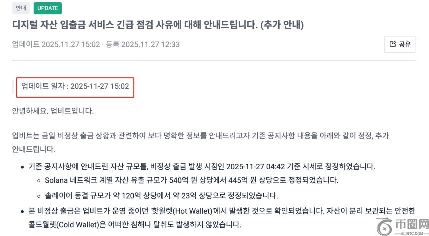 - 本次非常规提现确认是在 Upbit 旗下热钱包中发生的,冷钱包隔离资产并未发生**入侵或被盗。