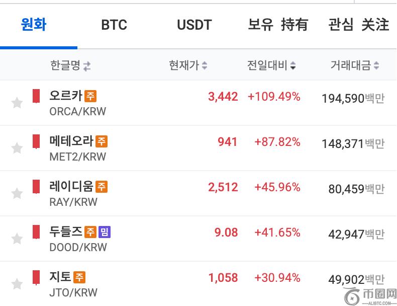 截至撰稿时,据 Upbit 网站数据,ORCA 单日涨幅仍有 109.49%;MET 单日涨幅约为 87%;RAY 单日涨幅约为 46%;DOOD 单日涨幅约为 42%。至于具体的上涨原因,Crypto Quant 创始人 Ki Young Ju 发文表示,Upbit 遭遇黑客攻击而暂停提现后,或因套利机器人暂时停摆,韩国散户资金趁机在平台内推高多种山寨币价格。