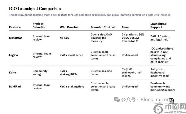 目前,Legion、Buildlpad、MetaDAO 和 Kaito 等平台正在涌现,成为新型 Launchpad 的代表。**步是对 ICO 项目进行审核,以确保投资者对 Launchpad 平台的信任;下一步则是审核参与的投资者,以确保资金分配符合项目标准。