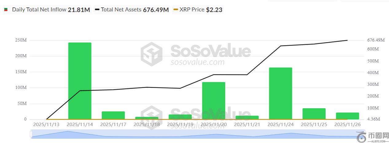 SoSoValue 的数据还显示,从 11 月 14 日开始,四只 XRP ETF——Canary、Bitwise、Grayscale 和 Franklin——录得正净流入。连续九天因此,这些 ETF 持有的总资产超过 6.7 亿美元。