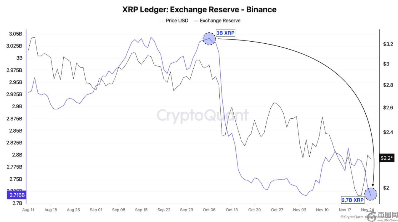 全球**的加密货币交易所正在密切关注其动态。XRP根据**消息,储备金会实时消失。加密量化数据显示,截至10月6日,该交易所持有约30.2亿枚XRP。而截至目前,这一数字已缩减至约27.1亿枚——不到两个月的时间里,订单簿上就减少了3.1亿枚XRP,按当前价格计算,价值近6.9亿美元。