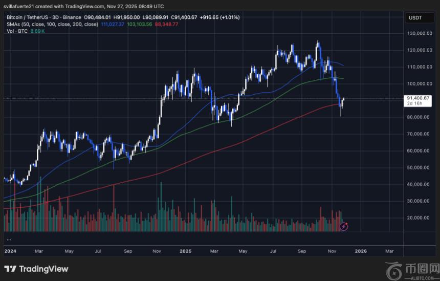 比特币在经历了从历史高点 12.6 万美元暴跌至 8 万美元区域后的**实质性反弹尝试。在 3 天图表上,比特币价格已从 200 日移动均线(红线)附近强劲反弹,该均线在历史上一直是深度回调期间的重要支撑位。此次反弹将价格推回至 9.1 万美元区域附近,但上涨势头依然脆弱。