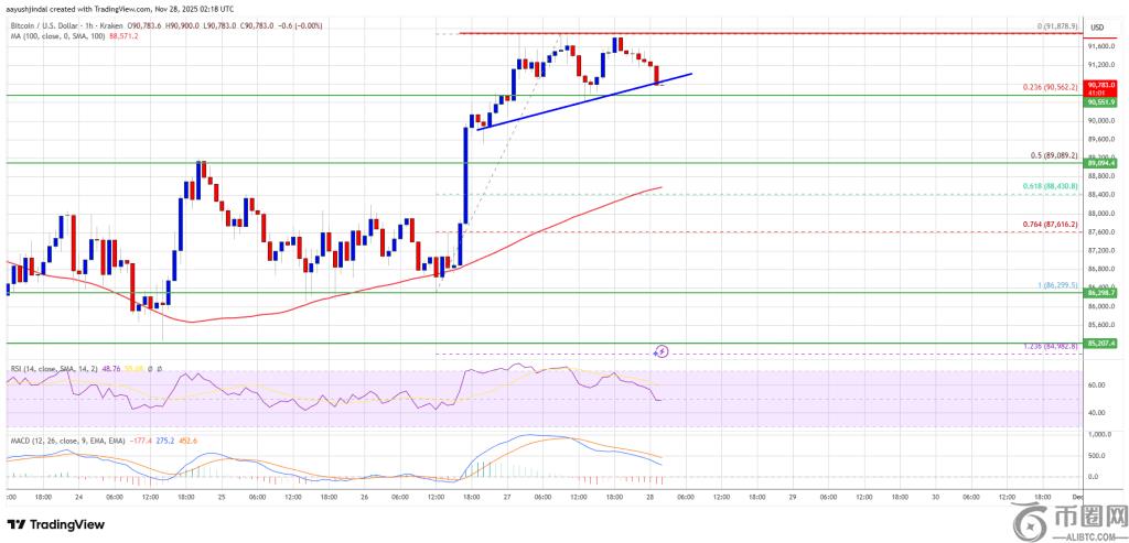 目前,比特币价格正接近从 86,299 美元低点到 91,878 美元高点上涨行情的 23.6% 斐波那契回撤位。比特币目前交易价格高于 90,000 美元和 100 小时简单移动平均线。如果多头继续保持强势,价格可能尝试再次上涨。