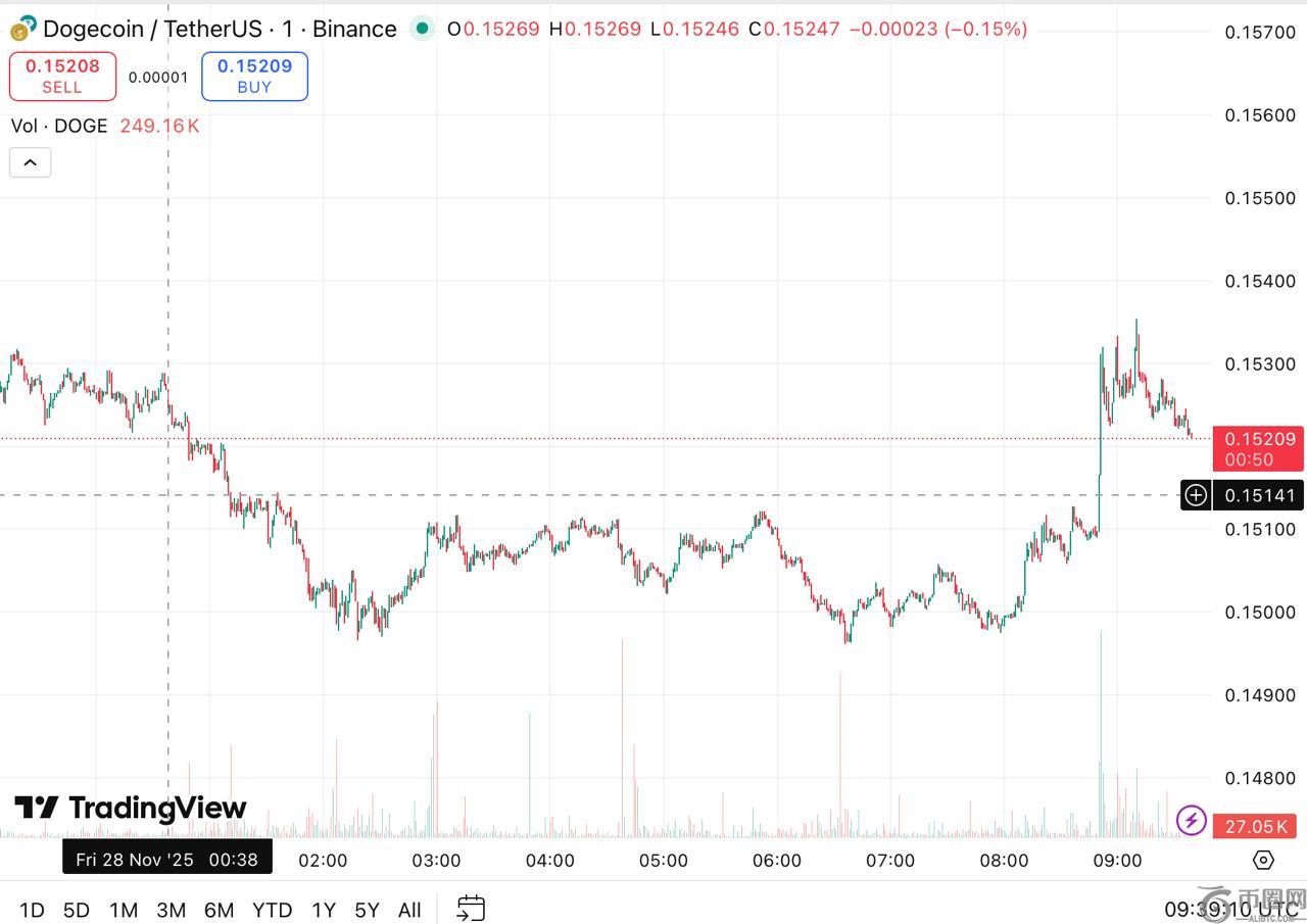 狗狗币交易价格约为 0.15 美元。市值